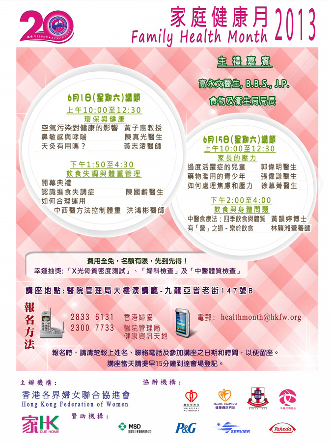香港婦協主席林貝聿嘉表示,該會一直為關注及改善婦女的健康而努力。今年是婦協成立20周年,除了一連串慶祝項目之外,更持續舉辦有關促進市民健康的活動。「健康月」到今年已經踏入十二周年,講座議題由最初婦女健康,推廣至男女老幼、生活保健、治未病及中西醫療新知等,在過去十一年,每年定期將健康文化帶到各家庭,深受市民歡迎。今年更新增各項健康議題,包括「環保與健康」、「飲食失調與體重管理」、「家長的壓力」及「飲食與身體問題」,藉此提昇市民對各新健康議題的關注。活動召集人梁冬陽醫生表示,「家庭健康月」自發起至今,一直得到各界人士關注及積極參與,她特別感謝各主禮人出席、各個協辦機構的支持、多位資深醫生及醫師百忙中抽空擔任講者、各藥廠慷慨贊助免費檢查、各電台節目及報章義務協助宣傳。